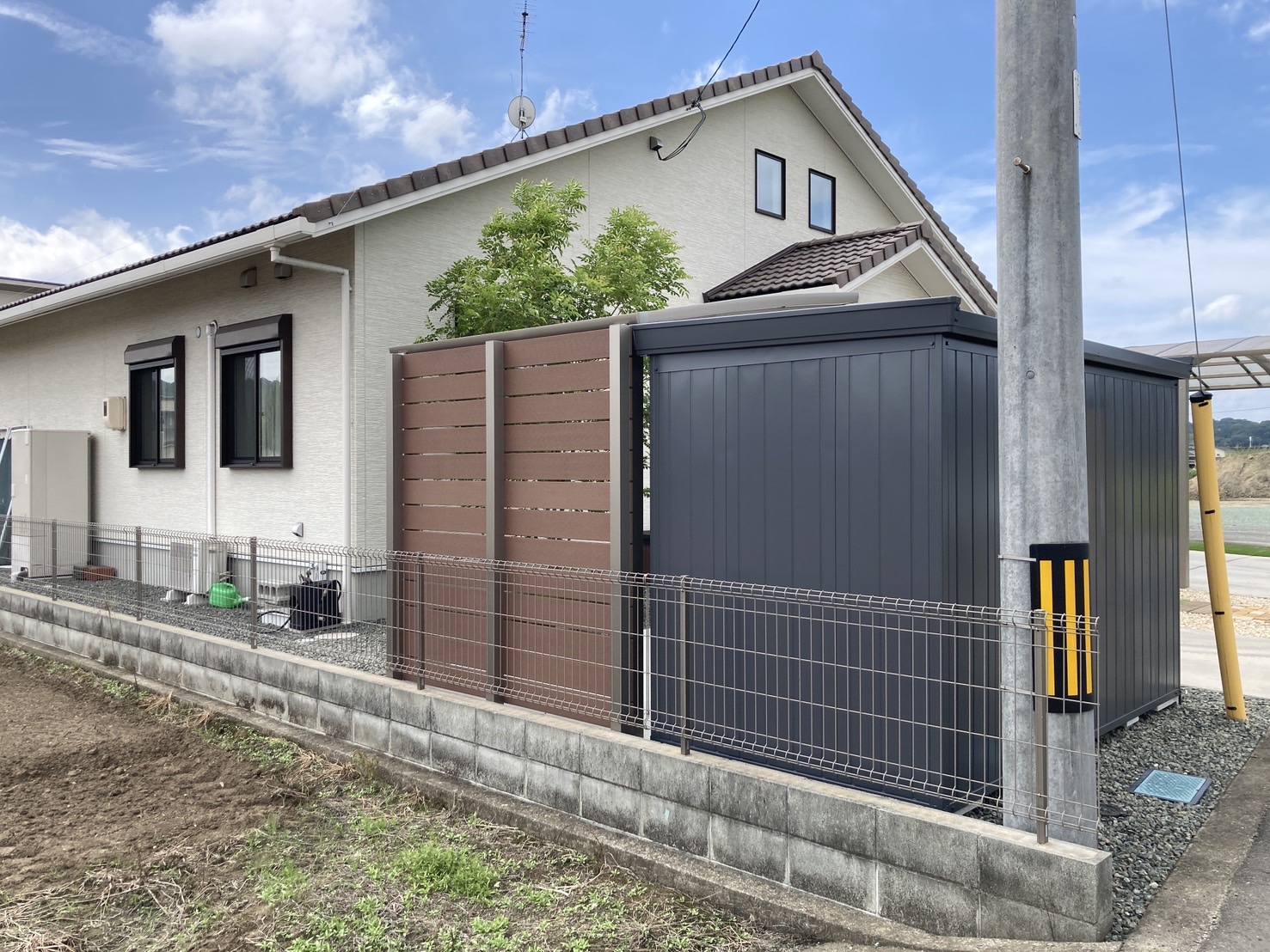 JUN 10 2022 エクステリア 【施工事例|福山市】レンガと枕木風コンクリートを使ったアプローチ(ナチュラル)|ランドワークス 【神辺町/O様邸】 お客様のお悩み・ご要望 新築外構 ランドワークスからのご提案・施工内容 土間コンクリート・カーポート・アプローチ・境界ブロック・フェンス etc お客様の声 広々とした敷地に三角屋根の可愛らしい平屋を建てられたO様 お家の雰囲気に合うナチュラルな外構を希望。 とても穏やかで可愛らしいご夫婦とお嬢様の3人家族のお宅です。 一番にこだわられたのは、アプローチとポストと表札。 アンティークレンガと枕木風コンクリート。 周りにイエローの化粧砂利を敷き詰めました。 アプローチの間には、タマリュウを植え緑をプラス。 赤いポストの下にも寄せ植えをして、色彩豊かな玄関周りに。 (ポスト:セキスイデザインワークス・ボビ) アイアンの表札とアルミの角柱(木目調)もこだわりの一つです。 駐車スペースには、2台分のカーポートを設置。 来客用にもう一台分の駐車スペースを設けています。 再びご依頼をいただきました。 今回は暮らしをさらに快適にするための追加工事です。 サイクルポートの設置 三協アルミ カムフィエースミニ 自転車を雨や日差しから守るサイクルポートを新たに設置しました。 日常使いの自転車がより快適に保管できるようになり、お子様の自転車や通勤用のバイクも安心です。 フェンス工事 エコモックフェンス 隣地との境界にフェンスを施工。 雨の侵入を防ぎ、大切な自転車などを雨から守ります。 プライバシーを確保しつつ、外観デザインにも馴染む仕上がりになっています。 お庭全体の印象も引き締まりました。 物置の設置 イナバ フォルタ FS-3015SFスタンダード 一般型 ガーデニング用品やアウトドア用品を収納できる物置も設置しました。 収納スペースが増えたことで、お庭や玄関周りがよりすっきりと使いやすくなっています。 お問合せ ランドワークス株式会社 〒720-2412 広島県福山市加茂町下加茂102-3 TEL 084-959-5160 / FAX 084-959-5170 MAIL : info@landworks-fukuyama.com エクステリア・外構工事は カーポート・テラス・ウッドデッキの設置、植栽 (木・寄せ植え)など お庭の事ならどんなことでも対応いたします。 対応エリア 〈広島県〉福山市・尾道市・三原市 〈岡山県〉笠岡市・井原市・倉敷市 その他のエリアでも、お問合せ下さい。 ランドワークスでは、LINEで無料相談も受付中。 エクステリア・外構でお困りのことがありましたら、お気軽にご相談ください。 LINEお友達追加はこちら ご用件 (必須) 新規御来店予約御来店予約(2回目以降)御見積り依頼その他(ご相談) お名前 (必須) ふりがな (必須) メールアドレス (必須) お電話番号 (必須) 郵便番号 (必須) ご住所 (必須) ご質問・お問い合わせ内容 ※必須入力情報に不足がある場合、お問い合わせが正しく送信されない場合があります。 送信ボタンをクリックする前に再度ご入力内容の確認をお願します。 ※お問合せ頂いた方には自動返信メールと、確認したスタッフより折り返しのメールをさせて頂いております。 セキュリティ設定や、迷惑メール設定をされていましたら、「info@landworks-fukuyama.com」からのメールを受信できるよう、 迷惑メール設定から解除、もしくは受信設定をして頂く様お願い致します。 LINE note エクステリア, ガーデン カーポートとガレージでこだわりの詰... 必要なものを詰め込んだ 和モダンな...