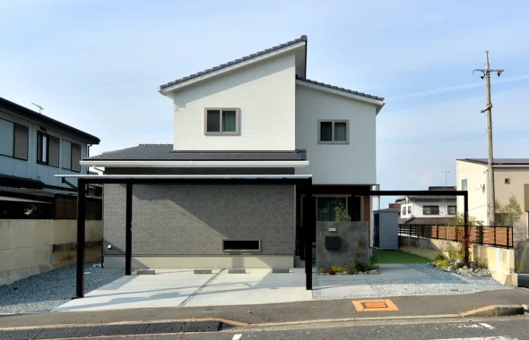 タイルテラスとカーポート(ダブルフェース)のある家